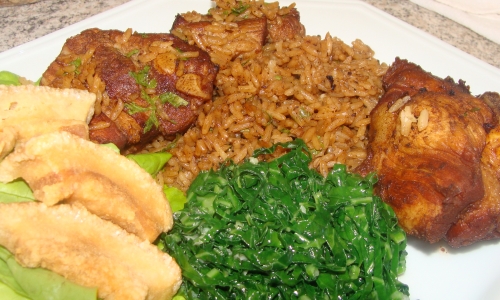4. Quando terminar de fritar tudo, separe as costelinhas em um prato e aproveite os residuos que ficaram no fundo da panela, colocando a cachaca e mexa ate desgrudar tudo do fundo, coloque o arroz, mexa bem para misturar com o caldo, coloque o acafrao aos poucos para verificar a quantidade suficiente